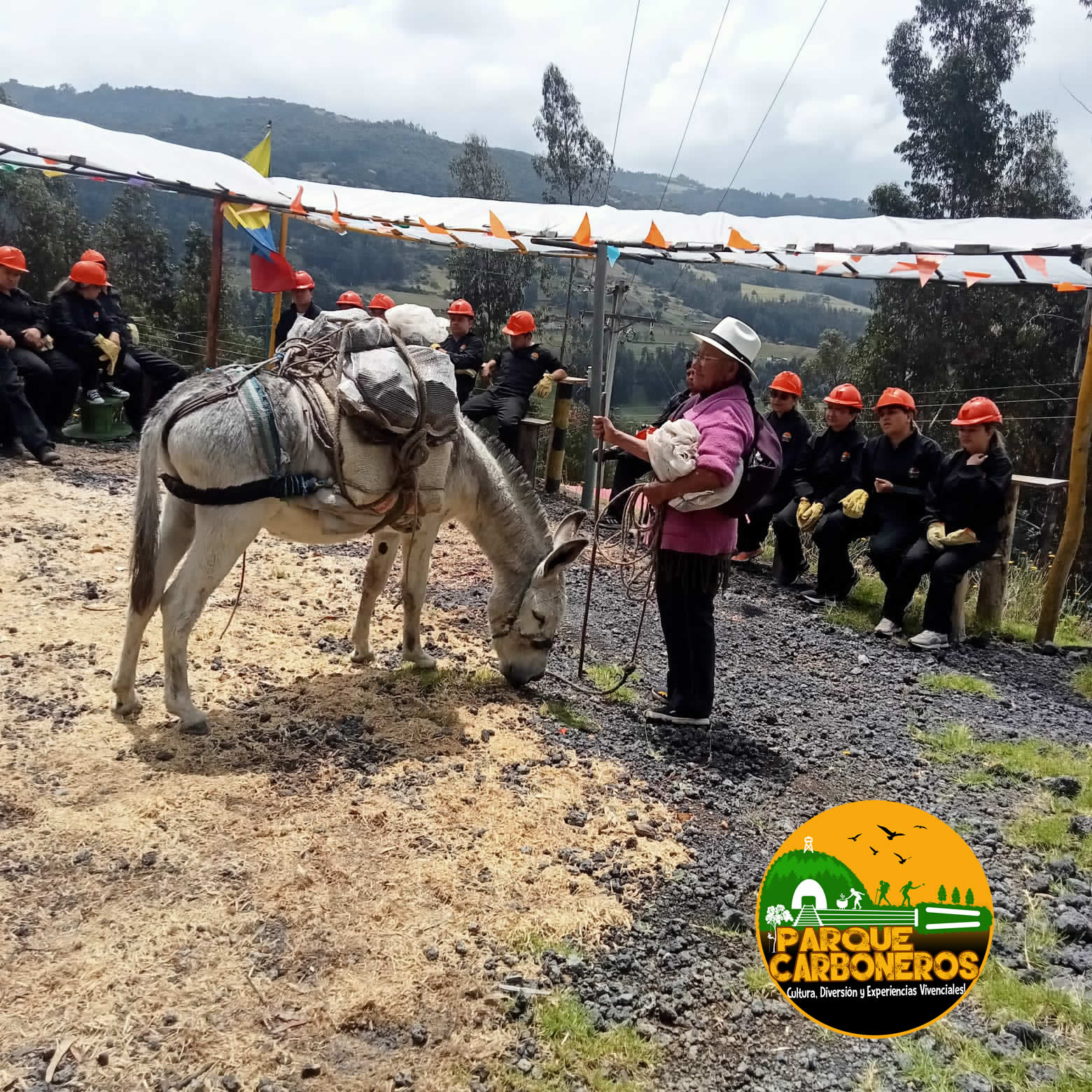 A la terraza dispuesta para la actividad llega la señora con su burrito  y comienza a explicar cómo se desenjalma al mismo tiempo que va  explicando las partes de los aperos.Se pide a los asistentes para que ayuden a aperar el burro, escoger el carbón,acomodar las cargar,subirlas y asegurarlas hasta  que la carga esta lista para llevarla. Durante la actividad la señora va contando su historia, como comenzó, cuanto le pagaron por su primera carga,donde la comercializaba,cuanto demoraba en ir hasta Sogamoso y regresar,etc.